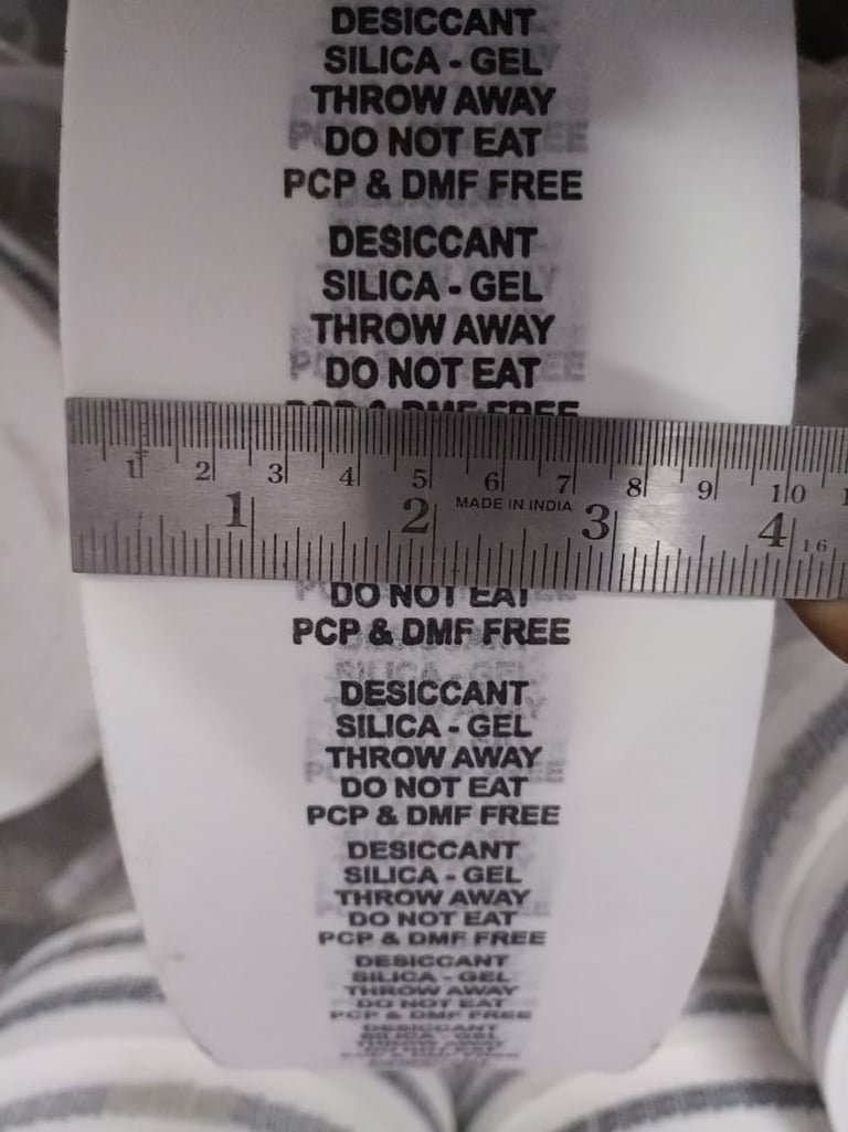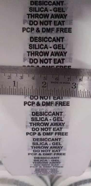 This image features printing on non-woven material used for silica gel sachets. The fabric is breathable and durable, making it an ideal choice for moisture-control packaging. The bold and clear printing displays essential instructions such as “Do Not Eat,” “Throw Away,” and “PCP & DMF Free,” ensuring safety and compliance. Once processed, the material is converted into small sachets that protect products like medicines, electronics, footwear, garments, and food items from moisture damage. This sample highlights how precise printing enhances both functionality and safety in everyday packaging.