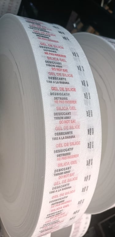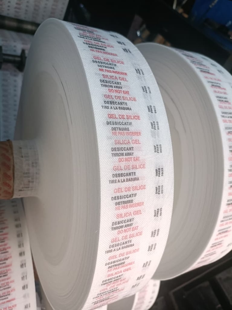 The reel in the image highlights high-quality double-colour printing carried out on non-woven material, specifically designed for silica gel sachets. The use of two colours—red and black—creates a strong visual contrast, making critical instructions clear and easily noticeable in multiple languages. This combination not only enhances readability but also adds a professional finishing touch that supports safety, compliance, and brand reliability.