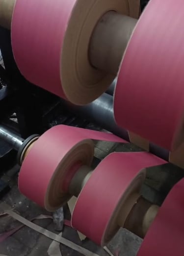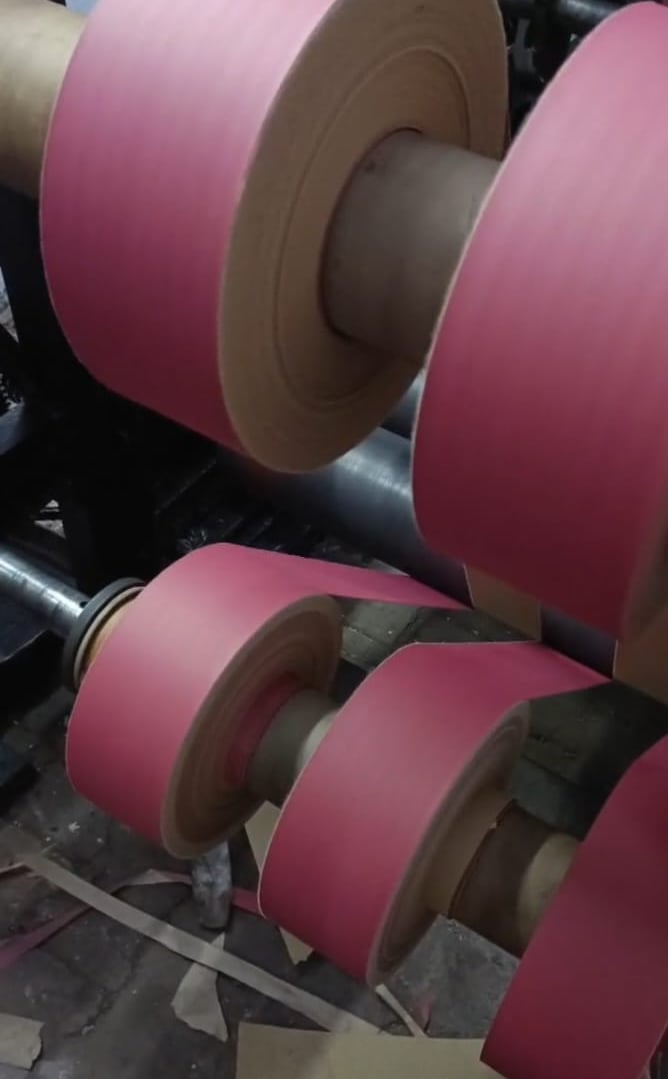 Slitting of brown kraft paper with a rich mahroon coating is carried out with precision to ensure smooth edges and a clean finish. The process involves accurate cutting into proper sizes as per requirement, followed by tight and uniform rewinding. Each roll is neatly prepared with consistent tension, eliminating issues like loose winding or uneven rolls. The mahroon coating remains intact during the entire process, with no smudging or surface damage, reflecting the care taken in handling.